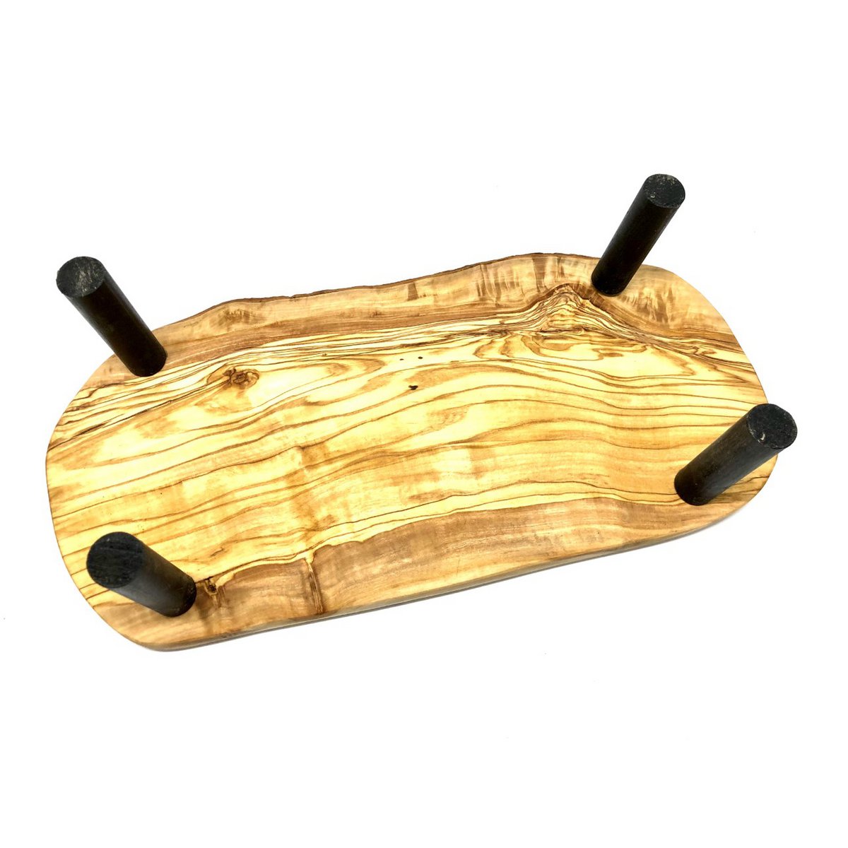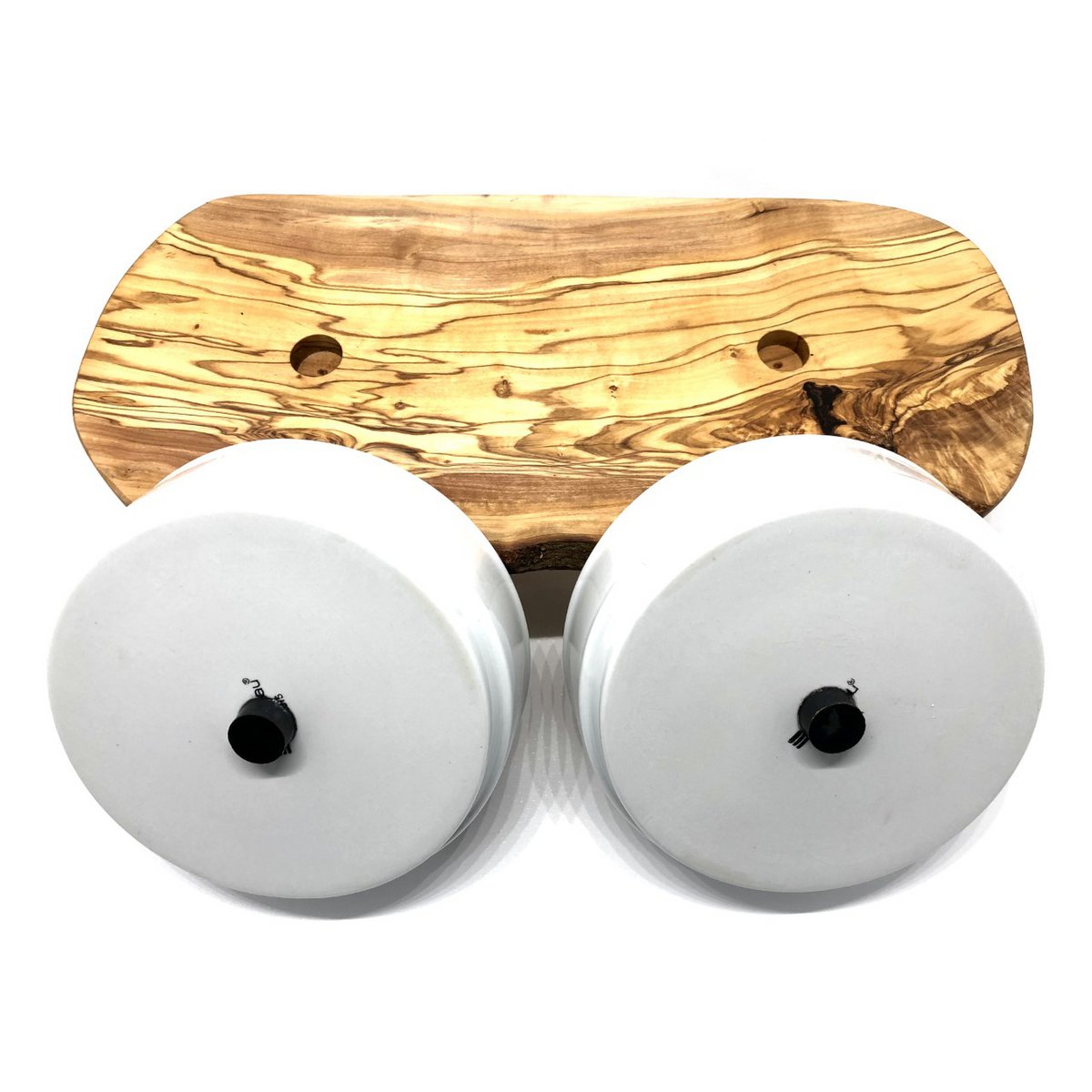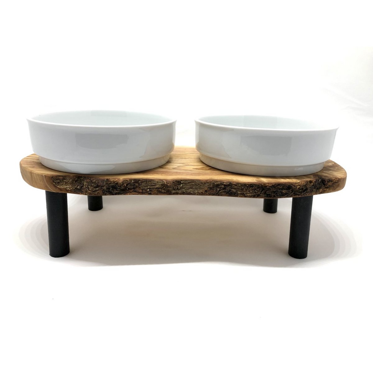 Porseleinen voeder kommen op standaard van olijfhout
